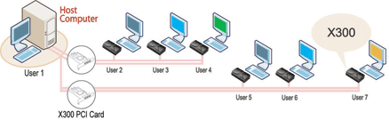 Модель NComputing X300 обеспечивает работу до семи пользователей на одном ПК. В конфигурацию рабочих мест входят стандартные мониторы, клавиатуры и мыши. Производитель подчеркивает малое энергопотребление терминалов доступа – 1-5 Вт в расчете на одного пользователя. Для сравнения – типовой ПК потребляет не менее 115 Вт. Как утверждается, система совместима с приложениями для Windows и Linux. Стоимость одного рабочего места составляет примерно 70 долларов.