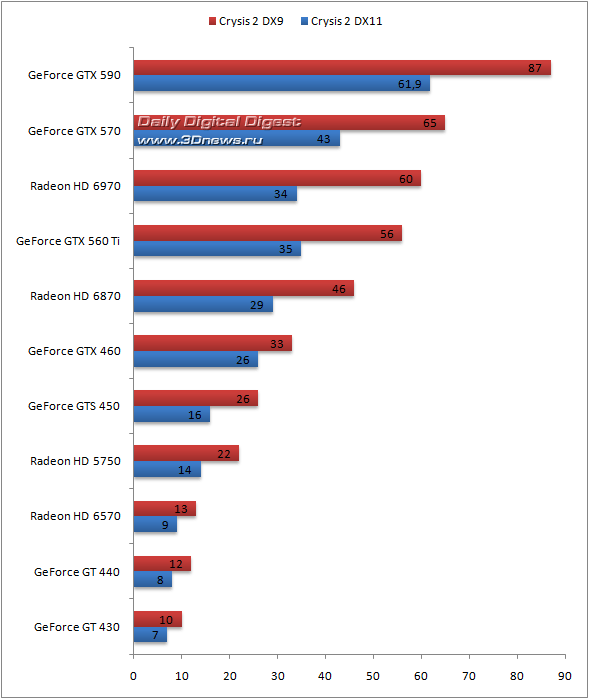 Плата за переход игры Crysis 2 в режим DirectX 11 оказалась очень высокой. Новое обновление DirectX 11 Ultra Upgrade практически ополовинивает значение FPS в сравнении с режимом DirectX 9. Приемлемым можно назвать использование видеокарт от GeForce GTX 560 Ti и выше. Для комфортного отстрела монстров все же лучше использовать GeForce GTX 570/580/590 или Radeon HD 6990.