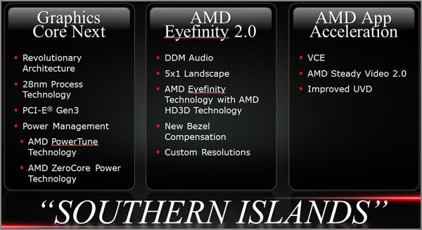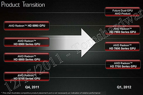 Вскоре после выпуска на рынок флагманских одночиповых ускорителей Radeon HD 7970 и HD 7950 нового поколения AMD представит и 28-нм двухголового монстра Radeon HD 7990, который также будет использовать архитектуру Graphics Core Next. Судя по попавшему в Сеть внутреннему слайду AMD, запуск HD 7990 состоится в конце первой четверти 2012 года. Ускоритель, вероятнее всего, будет построен на двух чипах Tahiti XT, объединённых в единое целое с помощью технологии CrossFireX.