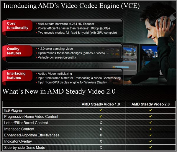 Помимо всего прочего, в продукте использованы такие прогрессивные инновации, как улучшенный интегрированный видеопроцессор Unified Video Decoder (UVD) с поддержкой H.264/AVCHD, VC-1/WMV profile D, MPEG-2, Multi-View Codec (MVC) и MPEG-4/DivX, фирменный движок Video Codec Engine (VCE) и технология AMD Steady Video 2.0.