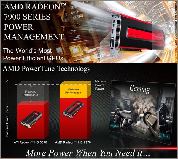 Наделив своё творение впечатляющей производительностью, создатели при этом позаботились и об оптимизации его энергопотребления. Для организации дополнительного питания служат специальные 8-контактный и 6-контактный разъёмы. Силами технологий AMD PowerTune Technology и AMD ZeroCore Power Technology потребляемая мощность видеокарты под нагрузкой составляет примерно 210 Вт, а в холостом режиме этот показатель снижается до завидных 3 Вт. Примечательно и то, что в состоянии покоя вентилятор ускорителя полностью отключается, а в бездействующей связке CrossFire «пропеллер» будет вращаться только у одного из графических адаптеров.