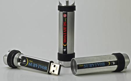 Компания Corsair начала выпуск защищённых USB-накопителей на основе флэш-памяти Survivor. Впервые это устройство было продемонстрировано во время выставки CeBIT. "Последний герой" довольно прочен, способен противостоять ударам, солёной воде и перепадам температуры.