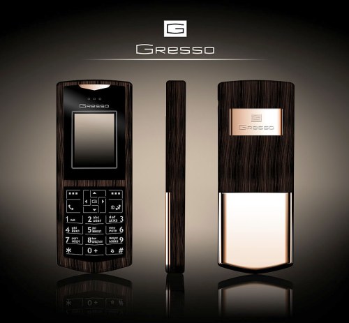 В этот раз на денежный сегмент нацелилась компания Gresso, штаб-квартира, которой, между прочим, расположена в России. Новая организация представила на суд толстосумов мобильный телефон - Gresso Luxury Phone. Дорогая трубка сделана из золота и африканского «чёрного дерева». При чём обещается, что каждый отдельный аппарат будет уникальным. Модели также имеют специальное анти-бликовое покрытие экрана, защищённые от внешнего воздействия клавиши и пр.