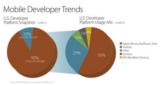 Рекламное агентство Millennial Media подсчитало, что в мае 56% всех разработчиков, базирующихся в США, создавало программы под Apple iOS. Это в два раза больше, чем у второго номера – Google Android. Лишь 5% пишут под Nokia Symbian, а 4% - под RIM BlackBerry. При этом 90% разработчиков, относящихся к 56%, не работают с другими платформами, а трудятся эксклюзивно на Apple.