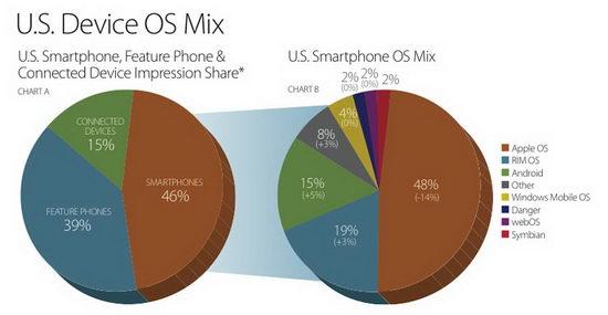 По данным запросов на выдачу рекламы Millennial Media, iOS занимает 46% рынка смартфонов, а Apple выступает крупнейшим производителем с долей в 25,4%. Вторым по популярности устройством после iPhone является BlackBerry Curve (7,92%), третьим – Google Nexus One (3,94%).
