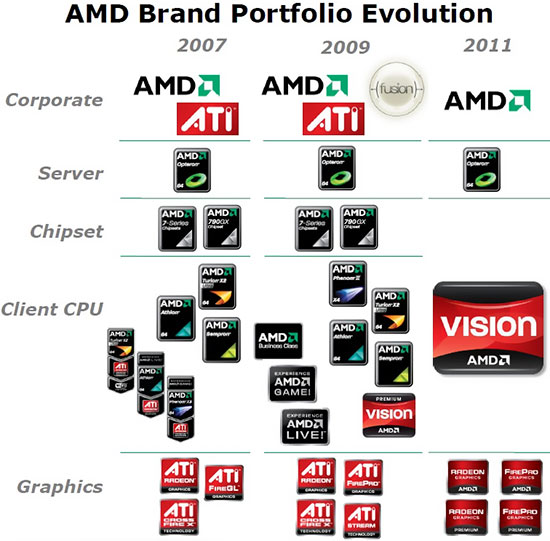 Рано или поздно это должно было случиться: AMD ликвидировала имя ATI полностью и собрала все бренды ATI (Radeon и FirePro) под своим основным именем AMD. В рамках новой схемы именования новые графические продукты, которые будут представлены AMD (к примеру, готовящаяся к выходу линейка Radeon HD 6000), не будут иметь никаких упоминаний об ATI ни в логотипе, ни в названии, ни в маркетинговых материалах. После объединения AMD и ATI многие журналисты уже давно именовали ускорители компании как AMD Radeon и AMD FirePro. Теперь это вполне официальные имена.
