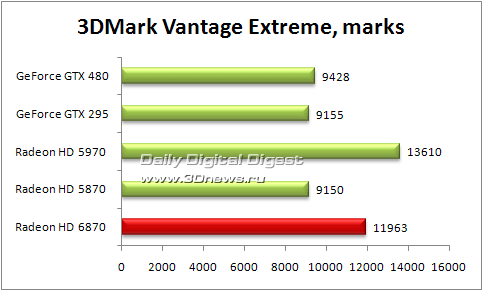 Примерно на 30% модель Radeon HD 6870 опережает Radeon HD 5870. Разумеется, это лишь в одном тесте. Каков расклад сил будет в игровых приложениях, еще предстоит узнать.