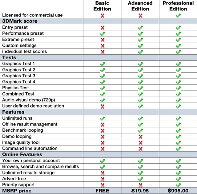 В 3DMark 11 существует три режима тестирования: начальный (Entry), производительный (Performance) и экстремальный (Extreme). Первый предназначен для тестирования систем с DX11-совместимыми графическими ускорителями начального уровня, включая ноутбуки и нетбуки. Второй — для тестирования большинства ускорителей (хотя для достижения плавного исполнения понадобится мощная видеокарта). Наконец, экстремальный режим призван создать максимальную нагрузку на карту, он предназначен, в основном, для энтузиастов. Бесплатная версия позволяет запускать только производительный режим тестирования и не даёт возможности устанавливать собственное разрешение и прочие настройки.