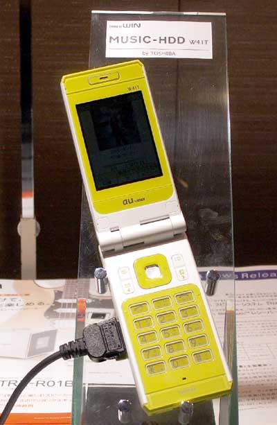 Компания KDDI сообщила о выпуске мобильного телефона W41T, оснащенного жестким диском. Форм-фактор накопителя - 0,85 дюйма, объем - 4 Гб. По оценке разработчика, этого объема достаточно для хранения 2000 песен. Cудя по снимку, устройство изготовлено в сотрудничестве с компанией Toshiba.